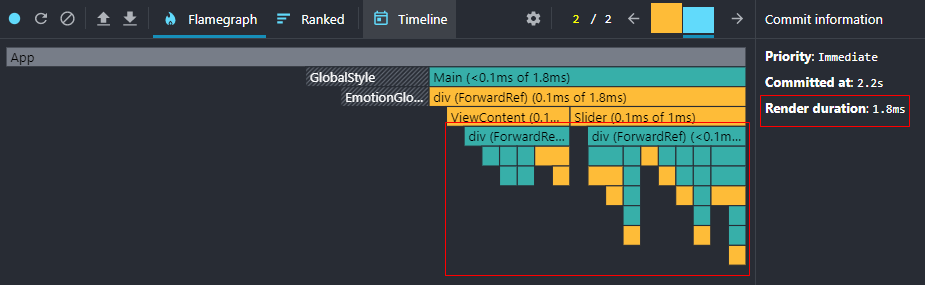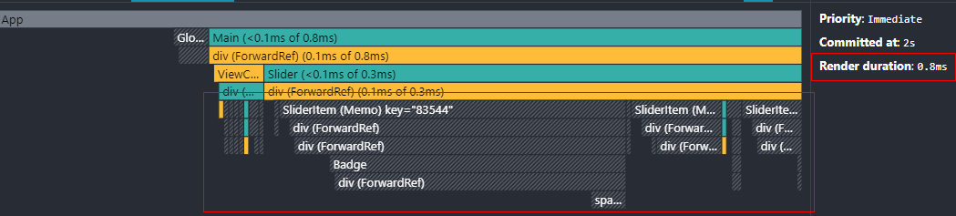 위 사진은 같은 동작 시 React Profiler에서 렌더링 되는 부분을 캡처한 것이다. 최적화를 하기 전에는 색깔별 박스는 렌더링 되는 요소들을 뜻한다. 최적화 후에 회색박스로 되어있는것은 해당 컴포넌트가 메모이제이션이 되었다는 뜻이다. 렌더링 최적화를 진행하여 같은 동작렌더링 시간을 1.8ms → 0.8ms 로 줄일 수 있었다.